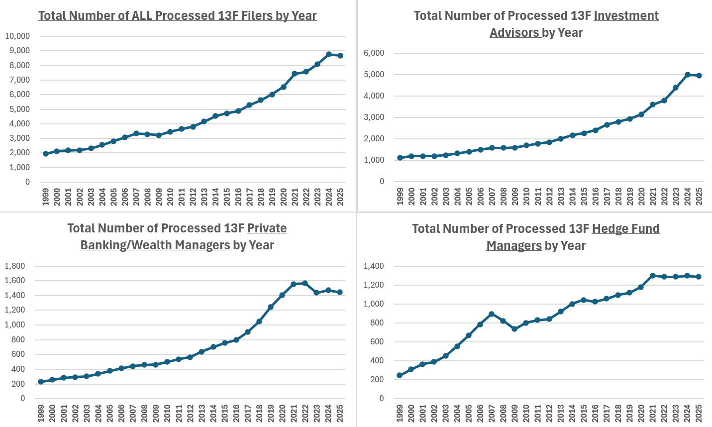 • As of the end of the 1st quarter of 2025, there were approximately 4,958 investment advisers, 1,445 wealth managers, and 1,289 hedge fund managers registered as 13F filers.