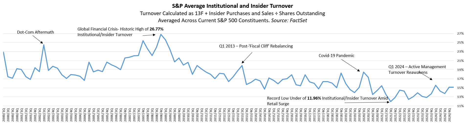 Using 13F filings and insider transaction data, the accompanying chart captures turnover as a percentage of shares outstanding, averaged across current S&P 500 constituents. Several inflection points mark this 25-year trajectory:
