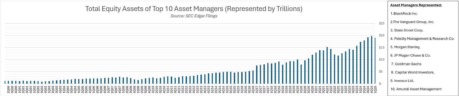 Over the last 15 years, the concentration of equity ownership among the top 10 asset managers has grown substantially. Their total equity assets under management (AUM) ballooned from under $3 trillion in 2010 to over $19 trillion in early 2025. This growth correlates with the meteoric rise of passive investing, largely driven by index-tracking giants like BlackRock, Vanguard, and State Street.