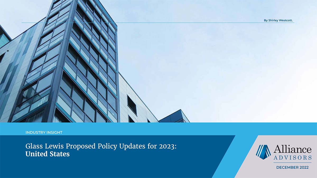 Alliance Advisors will continue to review and publish executive summaries on most of Glass Lewis’ 2023 policies as they become available. Furthermore, Alliance’s highly experienced traditional Governance and ESG analytics professionals can provide guidance and expertise needed to enhance the shareholder engagement process, maximize policy support and underwrite successful resolution advisory support such as board composition and competency reviews, executive and board remuneration structure evaluation, as well as ESG and sustainability strategy assessment and corresponding disclosure.